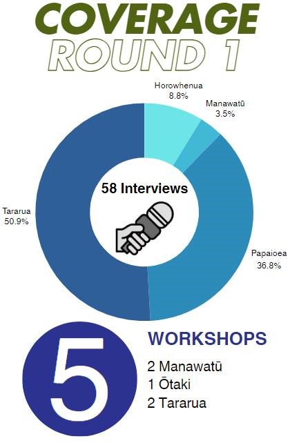 Round 1 has seen good coverage in Tararua and Papaioea with Whānau interviews. We would like to increase engagements with Whānau through interviews in Manawatū, Ōtaki, and Horowhenua for Round 2.