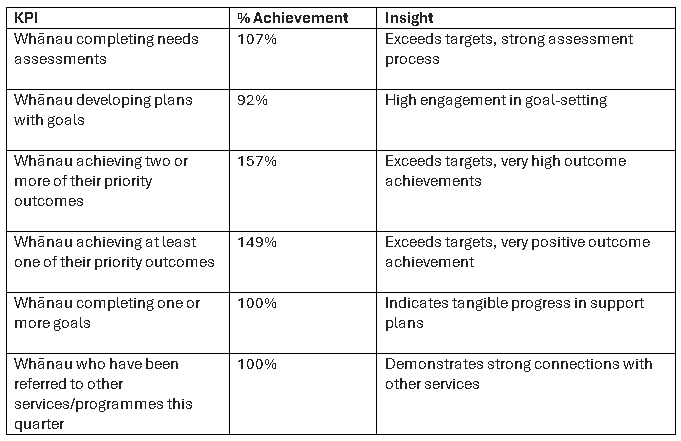 The Hauora Māori Services National Commissioning Performance Dashboard released on Monday 3rd February, highlights the impact of health and wellbeing services in our rohe, showing strong engagement with whānau Māori, high performance in assessments, planning and referrals and strong whānau satisfaction. With over 5000 whānau engaged in Hauora Māori Services over the July – September 2024 reporting period, achievement of key performance indicators for our rohe sits at 97%. Of particular note is the extent to which Hauora Māori services in this rohe exceed national targets. For example, providers and whānau together almost quadrupled the target relating to whānau achievement of two or more priority outcomes. Other highlights from the key performance indicators are shown in the following table: